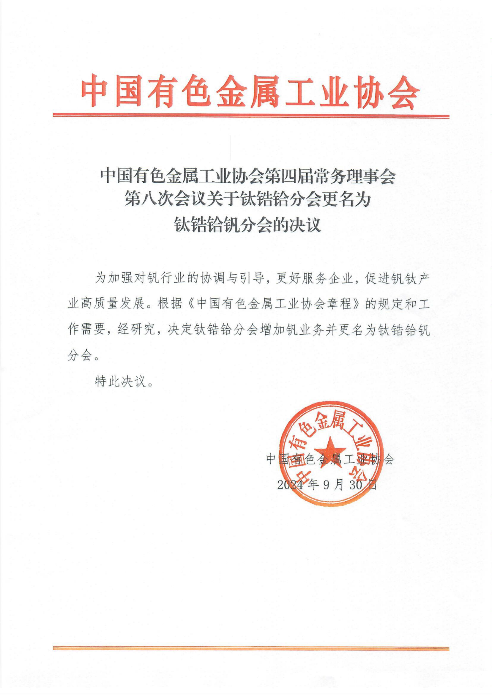 中国有色金属工业协会第四届常务理事会第八次会议关于钛锆铪分会更名为钛锆铪钒分会的决议