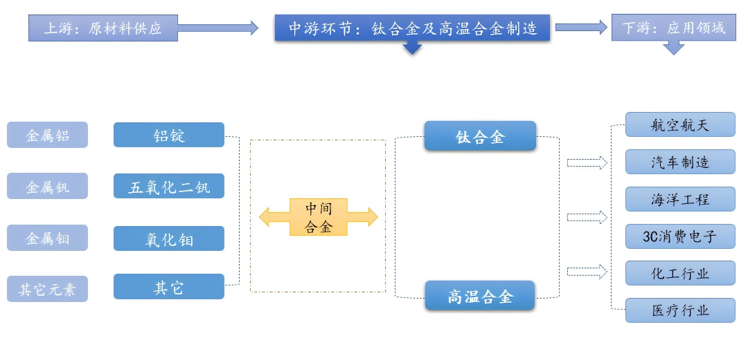 中间合金行业的下游主要是钛合金、高温合金等生产企业,将中间合金用于钛合金的熔炼和加工,生产出多种满足下游航空航天、海洋工程、3C消费电子等国民经济的诸多重要领域所需高端钛合金及高温合金等产品。