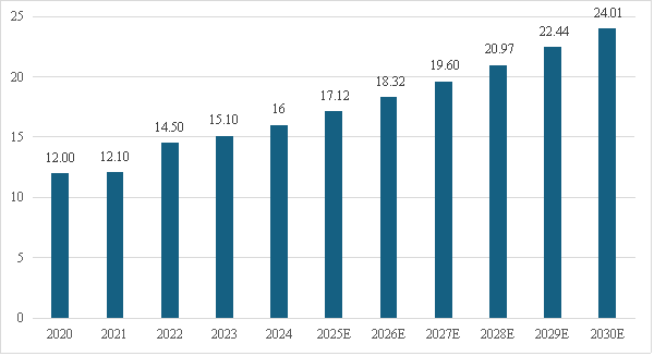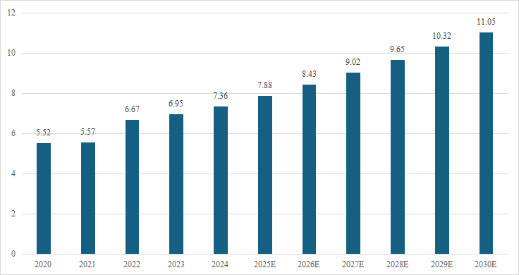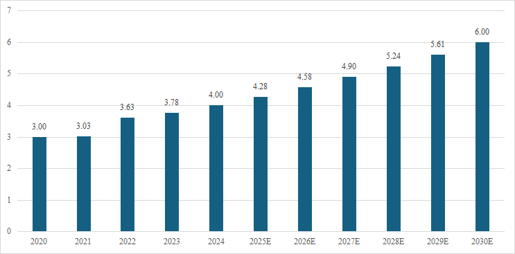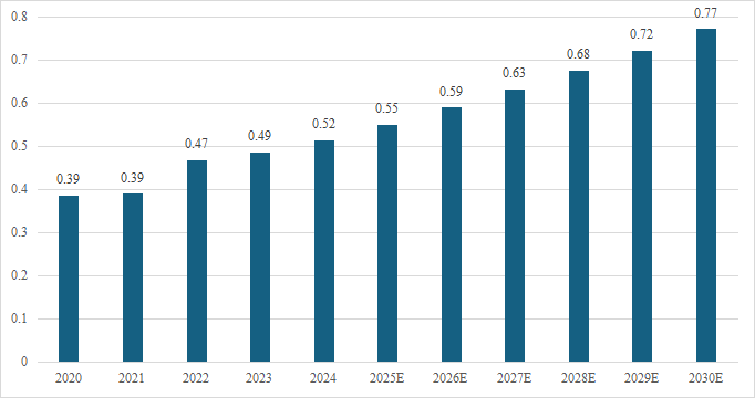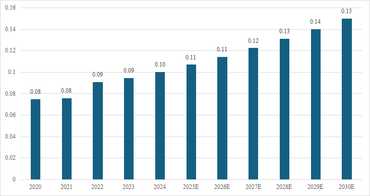 图6 2020-2030年中国钒铝中间合金市场规模及预测(单位:亿元)