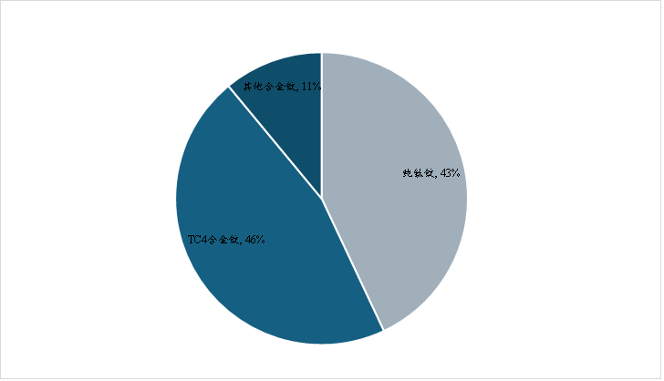 2024年中国各类钛锭产量占比,其中纯钛钛锭占比43%,TC4合金锭占比46%,其他合金锭占比11%。
