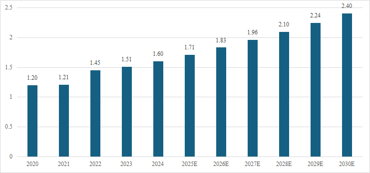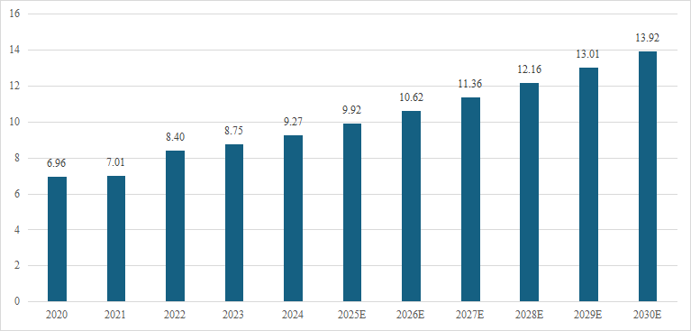图9 2020-2030年钼铝中间合金市场规模及预测(单位:亿元)